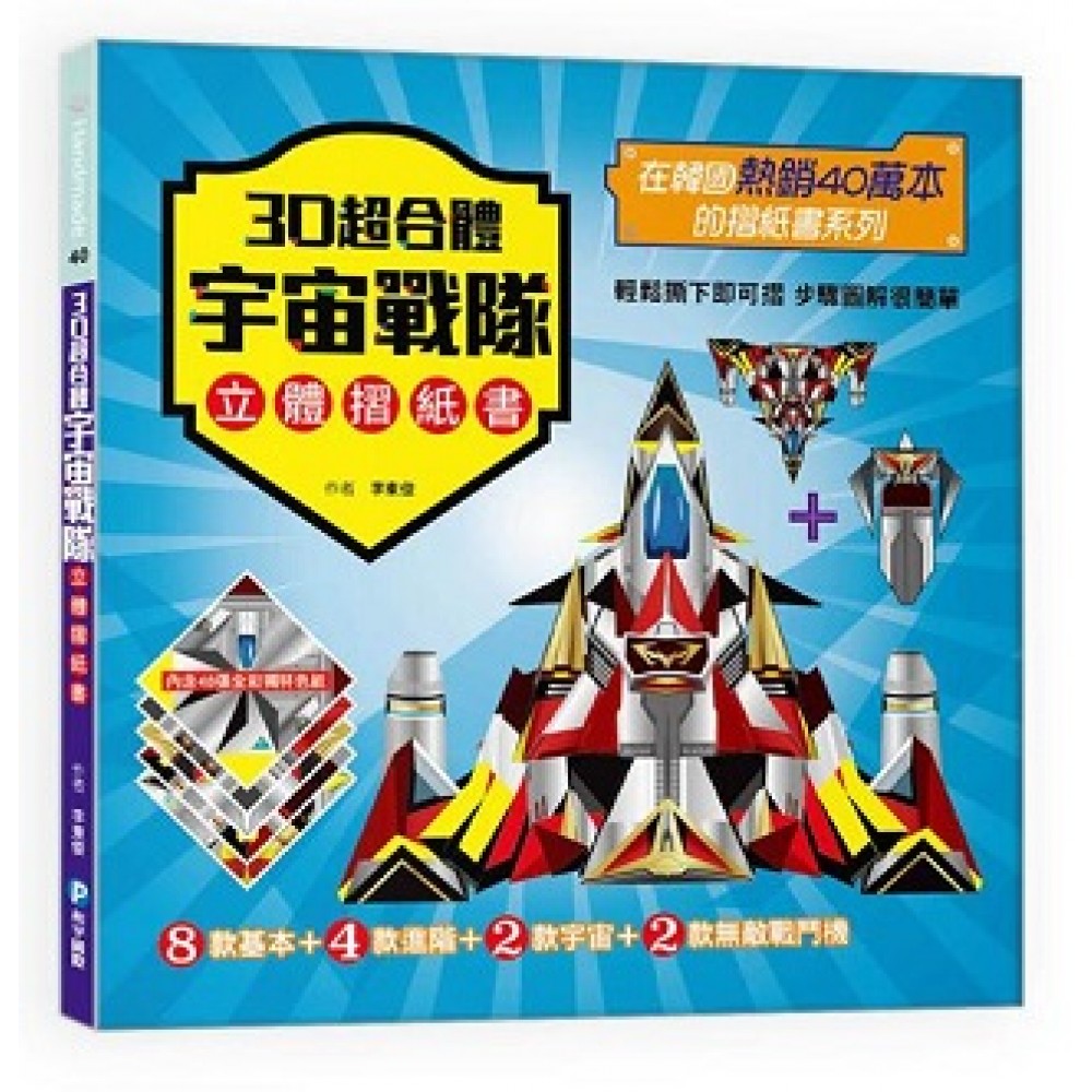 ★★★韓國熱銷40萬本摺紙書系列★★★ 無限組合方式隨你玩 創意大激發 獨立戰鬥機不夠厲害嗎? 教你組合成無敵蓋亞宇宙戰隊才夠看! 戰鬥機 + 戰鬥機 = ★宇宙戰隊 宇宙戰隊 + 進階戰鬥機 = ★蓋亞宇宙戰隊 蓋亞宇宙戰隊 + 戰鬥加農砲 = ★超級蓋亞宇宙戰隊 超級蓋亞宇宙戰隊 + 能量火王牌 = ★無敵蓋亞宇宙戰隊 【獨家設計48款金屬質感色紙】 韓國知名圖紙設計師獨家特計款, 用不同的顏色取代摺紙虛線, 全球獨一無二的高規摺紙, 讓你輕鬆開心摺! 【3D立體巨無霸無敵戰隊】 16款完全組合,讓你瞬間擁有巨無霸無敵艦隊! 打造25x30cm的獨家款立體紙模型, 讓你的成就感無限滿足! 【步步圖解明瞭易懂】 近五百張的圖解步驟, 搭配文字解說及圖示, 輕易上手成大師! 【協調、專注、創意三合一】 鍛鍊你的手眼協調! 訓練你的專注集中! 激發你的大腦創意! ★★★特別收錄:宇宙戰隊短篇漫畫 本書特色 ※金屬質感全彩色紙,打造獨特的立體紙模型。 韓國知名圖紙設計師崔光鎮獨家設計,酷炫程度無人能敵! ※輕鬆撕下即可摺,免用剪刀最安全。 不需要剪刀膠水,酷炫色紙撕下就可以直接摺,帶到哪都能玩! ※無限組合任我行,激發大腦創造力。 想像力就是你的超能力,延伸天馬行空的創意,怎麼組都可以!