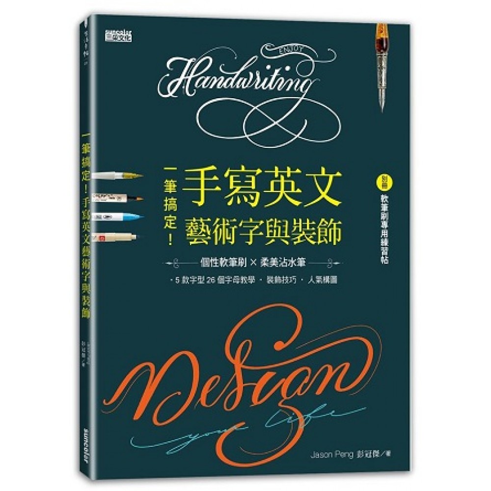 英文藝術字大進擊! { 個性軟筆刷 × 柔美沾水筆 } 5款字體26個字母教學、裝飾技巧、人氣構圖, 活用工具、善用技法,讓軟硬筆自由地在紙上遊走~ 內含別冊「軟硬筆專用練習帖」,4款樣式隨時練習! ∣ 大人的英文書寫 ∣ 軟筆刷是一種可寫出粗與細的工具,書寫掌握度高且容易變化與裝飾。 書中有詳細的「軟筆」、「硬筆」工具特點與使用心得介紹,還有你不能錯過的好感度字型介紹、幫你作品大加分的裝飾技法、靈活構圖法搶救你失敗的畫面及生活應用單元。 ●迷人工具房:15款最常用的軟筆與沾水筆。 ●字型練習室:5款變化字型,從Aa~Zz清楚筆順講解。 ●常用構圖:水平構圖、垂直構圖、三角構圖、十字構圖、圓形構圖、環狀構圖、X形構圖。七大構圖提升作品。 ●裝飾線條:教你利用文字、線條、小元素平衡空間或延伸字形效果。 ●創意搭配:透過字體混搭、有色紙張、對比色使用、噴灑,豐富字形效果。 ●專用練習帖:專屬格線紙、全黑卡片紙、牛皮卡片紙、空白不暈紙,四樣式一次滿足!
