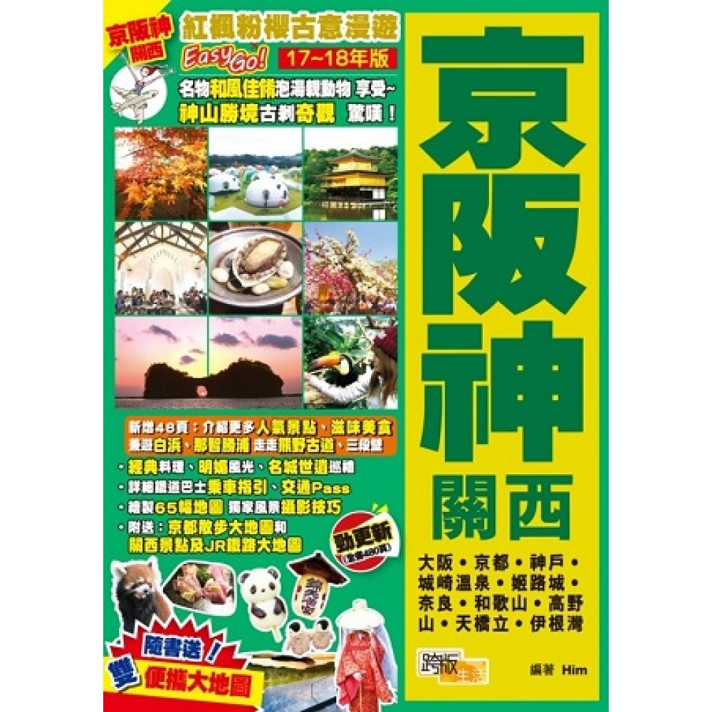 17-18年新版深入和歌山縣的白浜以及那智勝浦,為讀者展現關西神秘、莊嚴、寧靜、新鮮的一面!作者教路暢遊白浜的千畳敷、圓月島、三段壁等拍照或打卡必到之處,還有熊野古道、青岸渡寺三重塔、橋杭岩等那智勝浦熱點。此外,還發掘更多和歌市的景點,除了超有人氣的貴志川線探貓站長外,還有黑潮市場、可摘草莓或蜜瓜的農園紀之國,體驗關西另一種風情。 關西,是日本一處獨特、多元化的區域。那裏有數之不盡的世界遺產和世界文化遺產,有令人一洗塵俗的自然景觀,是春天賞櫻、秋天觀紅葉的熱門地點,更有精采玩不停的環球影城、神戶麵包超人主題館、海遊館、激流遊船、溫泉,自由生活的梅花鹿。食物方面,無論是精緻懷石料理、嵯峨燒、章魚燒、大阪燒、善哉、綠茶甜點、香滑柑橘味布丁、牛筋蛋飯、牛骨湯底拉麵、杮葉壽司都吃得到。 由香港坐直航機飛往關西的大阪約3個半小時,抵埗後便可開展或寫意、或刺激、或舒暢的關西之旅了!本書以最實用齊全的交通及地圖資訊,帶你暢通無阻遊走大阪、京都、神戶、奈良、高野山、和歌山的有趣角落,兼遊城崎溫泉、天橋立(看沙洲)及伊根灣(看船屋),吃地道美食、玩潮人玩樂、拍美景美物、掃趣緻商品,務必讓你盡興而回,去完再去! 附送兩幅大地圖:「京都散步大地圖」,教你在京都慢遊經典景點及賞櫻,以及「關西景點及JR鐵路大地圖」讓你暢玩關西無難度。 ‧新增48頁:介紹更多人氣景點、滋味美食 兼遊白浜、那智勝浦 走走熊野古道、三段壁 ‧經典料理、明媚風光、名城世遺巡禮 ‧兼遊天橋立、伊根灣、城崎溫泉、姬路城 ‧詳細鐵道巴士乘車指引、交通Pass ‧繪製65幅地圖 獨家風景攝影技巧 ‧送Wi-Fi蛋免1日租金Coupon ‧附送:「京都散步大地圖」和「關西景點及JR鐵路大地圖」