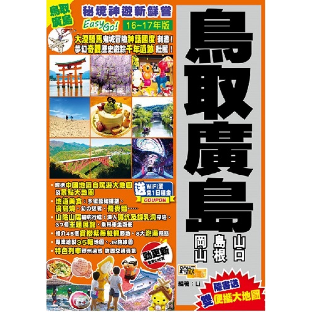 Part 1 繽紛旅程 精彩推介大檢閱 最喜愛的10大熱門景點 好吃到停不了的10大美食 10大手信回味珍貴旅程 6大人氣溫泉勝地 10大好玩博物館 10大賞櫻花、紫藤、紅葉熱點 Part 2 輕鬆預備 實用資訊 (日本中國地區全境地圖) 認識中國地區5大縣‧必備資訊‧全年精彩!年度祭典及活動‧飛往中國地區‧機場前往市區交通(廣島機場往中國地區、關西國際機場前往大阪及岡山、由大阪市前往中國地區) Part 3 暢遊山陰山陽交通攻略 (中國地區JR路線圖) JR鐵路暢遊(JR火車證一覽)‧特色JR遊走各地‧高速巴士路路通‧計程車‧輕鬆自駕遊 Part 4 特色行程愜意遊! Part 5 舒適住宿精選 Part 6 岡山縣 6.1【晴天之國 岡山市】 岡山市市內交通攻略(岡山市路面電車路線圖)(岡山市景點地圖) 岡山後楽園‧残夢軒‧岡山城‧岡山県立博物館‧林原美術館‧岡山市立東方美術館‧art space油亀‧SUN STATION TERRACE(麺屋匠)‧岡山一番街‧DOREMI之街‧café & rest muscat‧壽司海都‧天満屋岡山店‧奉還町商店街‧西大寺観音院‧最上稲荷神社‧吉備津神社‧吉備津彥神社‧備中高松城址(位置地圖)‧鬼之城 6.2【水鄉風情 倉敷市】 (倉敷市景點地圖) MITSUI OUTLET PARK‧天満屋倉敷店‧定食屋宮本むなし‧倉敷館観光案内所‧倉敷川泛舟體驗‧林源十郎商店‧倉敷物語館‧亀遊亭‧大橋家住宅‧大原美術館‧新渓園‧倉敷考古館‧桃太郎のからくり博物館‧倉敷民藝館‧日本郷土玩具館‧有鄰庵‧五十嵐優美子美術館‧KURASHIKI IVY SQUARE‧倉敷市立美術館‧倉敷貯金箱博物館‧阿智神社 6.3【繁華城下町 津山市】 (津山市景點地圖) 津山城‧衆楽園‧中山神社 6.4【高原上的歷史 高梁市】 (高梁市景點地圖) 備中松山城‧頼久寺 6.5【溫泉之鄉 美作三湯】 (美作三湯位置地圖)(湯郷温泉景點地圖) 湯郷温泉‧湯原温泉‧奧津温泉 Part 7 廣島縣 7.1【永念和平 廣島市】 廣島市市內交通攻略(廣島市路面電車路線圖)(廣島市景點地圖) 呉麺屋‧広島本通商店街‧ASSE‧新幹線名店街‧紙屋町パーラー‧福屋百貨店‧廣島燒屋台村‧原爆圓頂屋‧平和記念公園‧広島平和記念資料館‧国立広島原爆死没者追悼平和祈念館‧廣島世界遺產航路‧旧日本銀行広島支店‧広島県立美術館‧HIROSHIMA MUSEUM OF ART‧広島城‧世界平和記念聖堂‧縮景園‧広島市現代美術館 7.2【日本三景之一 宮島】 前往宮島交通攻略(宮島景點地圖 厳島神社‧千畳閣‧厳島神社表參道(鳥居屋とりい)‧厳島神社宝物館‧多宝塔‧大願寺‧宮島歴史民俗資料館‧大元神社‧宮島水族館‧大聖院‧紅葉谷公園‧宮島吊車 7.3【映畫文學勝地 尾道市】 尾道市市內交通攻略(尾道市景點地圖) 尾道映畫資料館‧千光寺山吊車‧千光寺公園‧千光寺‧猫の細道 Part 8 鳥取縣 8.1【砂丘之城 鳥取市】 鳥取市市內交通攻略(鳥取市景點地圖) シャミネ鳥取‧三代目網元魚鮮水産‧鳥取駅前商店街‧鳥取駅前食品市場‧鳥取民藝美術館‧わらべ館‧鳥取城跡.久松公園‧仁風閣‧観音院庭園‧鳥取温泉‧鳥取砂丘‧砂丘会館‧SUKATTO‧砂の美術館‧白兎海岸 8.2【世界級海岸公園 岩美町】 遊岩美町交通攻略(岩美町景點地圖) 山陰海岸國立公園(浦富海岸)‧田後神社 8.3【泡溫泉、觀候鳥 米子市】 米子市市內交通攻略(米子市景點地圖) お菓子の壽城‧米子水鳥公園‧加茂川‧皆生温泉 8.4【戶外體驗 大山町】 遊大山町交通攻略(大山町景點地圖) 鳥取花回廊‧大山‧大山トムソーヤ牧場‧大山寺‧大神山神社(奧宮)‧大山乘馬中心‧住雲寺‧妻木晚田遺跡‧名和神社 8.5【歷史尋幽 八頭郡】 (八頭郡景點地圖) 智頭宿‧石谷家住宅‧西河克己映画記念館‧諏訪神社 8.6【白壁建築及溫泉 倉吉市、東伯郡】 倉吉市市內交通攻略(倉吉市景點地圖) 打吹公園‧倉吉博物館・倉吉歴史民俗資料館‧白壁土蔵街‧倉吉線鉄道記念館‧鳥取二十世紀梨記念館‧三朝温泉‧柯南博物館 8.7【鬼太郎故鄉 境港市】 境港市市內交通攻略(境港市景點地圖) みなとさかい交流館‧水木茂之路‧水木茂紀念館‧海とくらしの史料館‧境水道大橋 Part 9 島根縣 9.1【神話國度 出雲市】 出雲市市內交通攻略(一畑電車路線圖)(出雲大社前站景點地圖) 出雲大社‧島根県立古代出雲歴史博物館‧神門通り‧ご縁横丁‧おくに茶屋‧旧大社駅‧出雲日御碕灯台‧須佐神社 9.2【水都之城 松江市】 松江市市內交通攻略(松江市景點地圖) 松江城‧興雲閣(松江郷土館)‧松江堀川遊覽船‧カラコロ工房‧八雲庵‧田部美術館‧小泉八雲記念館‧小泉八雲舊居‧松江堀川地ビール館‧宍道湖‧島根県立美術館‧松江貓頭鷹花園‧八重垣神社‧美保神社‧美保関青石畳通 9.3【泡湯美肌 玉造温泉】 前往玉造温泉攻略(玉造温泉景點地圖) 玉造アートボックス‧若竹寿し‧姫神広場‧姫ラボ‧湯薬師広場‧清巌寺‧玉作湯神社 9.4【未被開發的樂土 奧出雲周邊地區】 奧出雲周邊地區交通攻略(奧出雲周邊地區景點地圖) 「奥出雲おろち号」觀光列車‧清水寺‧和鋼博物館‧安来節演芸館‧足立美術館‧月山富田城跡‧加納美術館‧鬼の舌震‧絲原記念館‧田部家土蔵群(鉄の歴史博物館) 9.5【深入銀礦 大田市】 大田市市內交通攻略(大田市景點地圖) 石見銀山