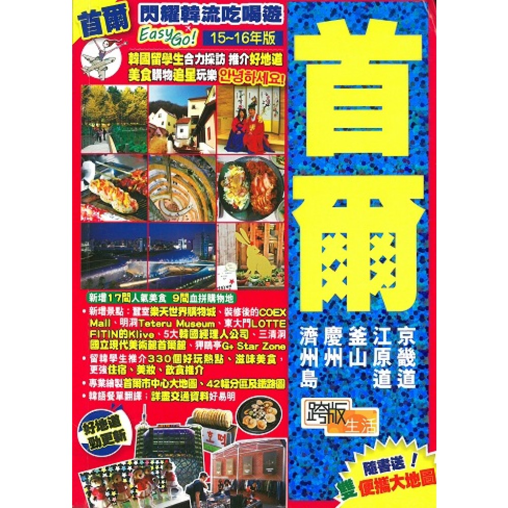 15-16年新版增加30個景點、美食及購物地,包括2014年底開幕的蠶室樂天世界購物城、裝修後的COEX Mall等、更多追星熱點;弘大、梨大、三清洞等地區人氣街頭小食;還介紹更多韓國地道美食:生菜包蠔仔五花肉、三拼豬腳、芝士燉雞、韓式烤鴨肉等。新版更附送雙地圖,專業繪製首爾市中心大地圖,各區景點位置一目了然。 韓國留學生提供了貼心的韓語餐單翻譯及實用韓語教學,即使不懂韓文,也能緊貼「韓流」,感受最Hit旅遊地方首爾的懾人魅力! 本書沿首爾地鐵線,教你用最方便的交通方法,逛盡各區旅遊熱點,包括明洞、南大門、東大門、市廳、鐘路區、仁寺洞、三清洞、大學路、梨大、弘大、西大門、新村、合井洞、梨泰院、狎鷗亭、新沙洞、三成洞、蠶室、汝矣島、鷺梁津、永登浦等;發掘超正地道美食,例如部隊鍋、豬腳、年糕鍋等;詳盡介紹熱賣好用化妝護膚品、各區韓風衣著打扮精品等;搜羅熱播韓劇相關景點;漫步韓國宮殿,欣賞朝鮮獨特建築風格。 本書特別附載首爾周邊的京畿道、江原道,以及韓國東南面的釜山、慶州及濟州,感受韓國大自然原始之美。 ․新增17間人氣美食、9間血拼購物地 ․新增景點:蠶室樂天世界購物城、裝修後的COEX Mall、明洞Teteru Museum、東大門LOTTE FITIN的Klive、5大韓國經理人公司、三清洞國立現代美術館首爾館、狎鷗亭G+ Star Zone ․留韓學生推介330個好玩熱點、滋味美食,更強住宿、美妝、飲食推介 ․專業繪製首爾市中心大地圖、42幅分區及鐵路圖 ․韓語餐單翻譯;詳盡交通資料好易明 ․隨書附送:首爾全巿大地圖,一目了然