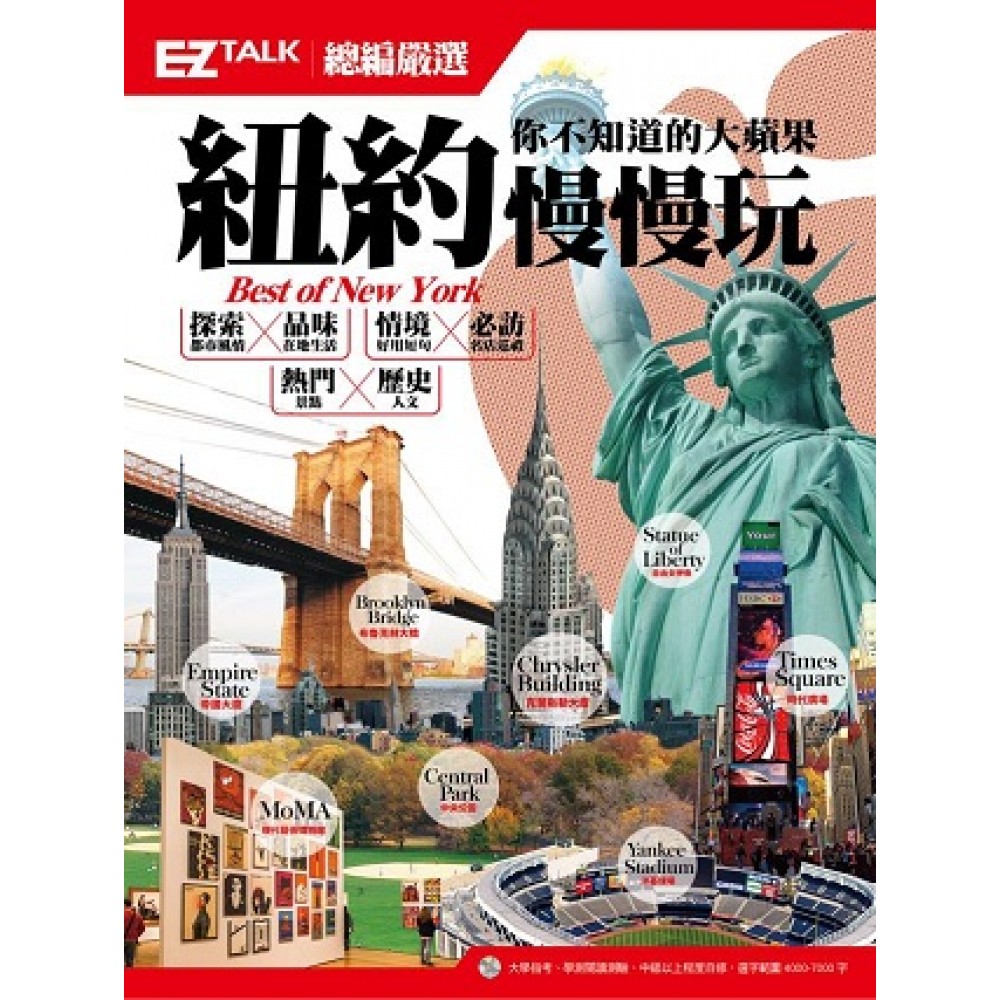厭倦那些走馬看花的旅遊書嗎? 那你肯定不能錯過《紐約慢慢玩》! 逛遍NYC 5大區,熱門打卡景點一網打盡! 帶著英語趴趴走,與紐約人聊紐約事, 盡情探索大蘋果的無限魅力! 紐約市,全美第一大城,位於紐約州東南角,有著「大蘋果」、「不夜城」、「高譚市」等稱號,783.8平方公里的陸地上,住了超過800萬人,每年到訪的遊客卻將近5,500萬人!這個超國際級現代大都會,以壯觀的天際線、除夕倒數、金融中心著稱,嘻哈音樂在此發源,街頭可見彩繪塗鴉⋯⋯但,紐約也有建於17世紀的老教堂、全球居冠的藝術博物館、百年歷史的古典樂團,車站穹廬繪有浪漫星象,最核心地段是座景觀都會公園,有湖、有森林、有動物保護區⋯⋯ EZ TALK要帶你在摩天樓叢林之間漫步,探索紐約各城區,感受它多元又獨特的人文風情與故事。別管都市的喧囂、繁忙、緊張,紐約值得你放慢腳步,悠悠走、慢慢玩、細細感受! 本書特色 特色一:繁華精彩大都會,古今趣聞談不完 你知道紐約曾經是美國的首都嗎?舊名是「新阿姆斯特丹」?《全民情聖》的埃利斯島在哪裡?帝國大廈觀景台因為哪部電影成為約會勝地?除了地鐵、小黃,紐約還可以搭渡輪?本書帶你了解紐約的前世今生,細數每個景點的趣聞及軼事。不論走到哪裡,不怕開口沒聊天話題,與當地人開心互動、建立情誼! 例: (紐約歷史) By the turn of the 20th century, New York had nowhere to grow but up, and skyscrapers began appearing on Manhattan’s skyline. Starting small with structures like the 22-story Flatiron Building (1903), skyscrapers grew taller and taller in the Roaring Twenties. The Wall Street Crash of 1929 brought the building boom to an end, but not before the completion of the Chrysler Building in 1930, which was the world’s tallest building until the Empire State Building stole the title a year later. 20 世紀初,紐約已經沒有空地可以開發了,只能往上發展,於是摩天大樓開始出現在曼哈頓的天際線。一開始先從規模小一點的建築蓋起,像是 22 層樓的熨斗大廈(1903年),在咆哮的 20 年代,摩天大樓越蓋越高。1929 年的華爾街崩盤為這場高樓建造潮劃下句點,不過真正的結束要等到克萊斯勒大廈在 1930 年完工時。帝國大廈在一年後奪冠以前,克萊斯勒大廈是全世界最高的大廈。 特色二:大小景點全搜集,展現各城區不同風情 從紐約市核心的曼哈頓區開始,自由女神、華爾街、時代廣場、百老匯、第五大道、中央車站、中央公園、《博物館夜驚魂》場景、梅西百貨⋯⋯都在這裡!過橋往北到布朗克斯區,看一場MLB洋基隊的比賽,還有全美最大動物園;往東,皇后區是紐約是最大行政區,種族文化最多元;往南,布魯克林區有美麗大橋,欣賞壯觀的曼哈頓天際線;西南邊的史坦頓島有免費渡輪可搭,島上保留開拓時期史蹟。除了主要地標,「這裡也好玩」介紹的周邊小景點也值得一遊喔! 例: (中城)高線公園 The High Line is a public park built on a section of elevated rail line that remained unused for years after closing in 1980. Starting on Gansevoort Street in the Meatpacking District, the High Line runs one-and-a-half miles north through Chelsea before ending on 34th Street just north of the West Side Yard. 高線公園是一座市立公園,建在一段高架鐵路上,這段鐵路於 1980 年關閉後荒廢多年。高線公園從肉品包裝區的甘斯沃爾特街開始,往北延伸 1.5 英里,經過雀兒喜區,到西城調車場以北的第 34 街為止。 「這裡也好玩」 Madison Square Garden 麥迪遜廣場花園 MSG 是一座多功能體育館,體育館能容納兩萬名觀眾,是美國職業籃球 NBA 尼克隊、職業冰上曲棍球 NHL 遊騎兵隊等紐約隊伍的主場,劇場設有 5600 個座位,經常舉辦各種演唱會、表演與集會活動。 特色三:特色美食、名店資訊,旅程更豐富盡興 到紐約旅遊,當然不能錯過特有的熟食店(deli)、義大利冰淇淋(gelato)、球場熱狗、明星餐車(food truck)等當地料理,書中收集了必訪店家,讓你旅行吃得開心!再教你如何買便宜戲票、免錢逛博物館、皇后區一日遊、暢遊中央公園、康尼島遊樂園,選擇多樣,玩得更開心! 例: 「紐約最佳美食廣場」 ・Chelsea Market——Oreo 餅乾在這裡發明誕生,這座百年老工廠樓上,有職棒大聯盟網站(MLB.com)、Google、YouTube 的辦公室,Food Network實境秀《美國鐵人料理》攝影棚也在此。 ・City Kitchen——2015 年才開張,就位在上演《歌劇魅影》的莊嚴劇院(Majestic Theatre)旁,方便到時代廣場一遊的觀光客,享用便利快速的美食。 ・The Plaza Food Hall——入口位在廣場飯店的中央公園側,沒有明顯招牌讓人卻步。在這個奢華的美食街可以吃到索價上萬元的魚子醬,但大多數女孩都是為了 Lady M 的蛋糕而來。 特色四:情境好用句,要你「聽得懂」也「說得溜」 配合搭車、米其林餐廳點餐、名牌精品店購物、百老匯看舞台劇等場合,整理5~8句常聽到及常說的會話語句,讓你在紐約與人輕鬆自然應答,暢談無礙! 例: 「現場購票 你要說得溜」 1. Hi. I’d like to buy four tickets for Saturday’s show, please. 嗨,我想買四張星期六的票。 2. I’m here to pick up tickets I bought online. 我來取網路上購買的票。 「現場購票 你要聽得懂」 1. We have a few balcony seats left, which cost $36.00. 我們還剩下幾個樓上的座位,票價三十六元。 2. Orchestra seating is available at $19.00,$36.00 and $54.00. 樓下座位還有十九元、三十六元和五十四元的。