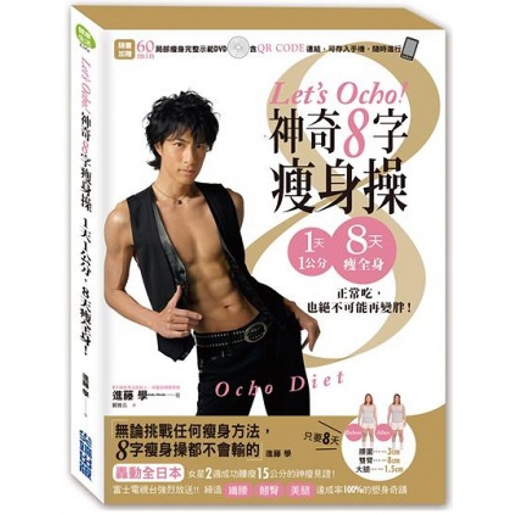 轟動全日本!話題引爆youtube 600,0000點閱率 日本富士電視台強烈放送!! 女星2週成功腰瘦15公分的神瘦見證! 締造「纖腰」、「翹臀」、「美腿」達成率100%的塑身奇蹟 ※隨書加贈60分鐘局部精雕指導DVD(附QR CODE連結,可直接將影片存入手機,隨時隨地都能開始進行!) ★2013年~2014年長踞日本亞馬遜書店最具話題,年度暢銷瘦身書 ★YAHOO關鍵字、轟動日本藝能、瘦身界、最受歡迎的瘦身新絕招--近藤學「8字瘦身操」 ★日本富士電視台強烈放送!女星、名模爭相體驗,公開8天腰瘦15公分的神瘦效果!引爆日本瘦身新話題! 什麼是Ocho?、什麼是8字瘦身操? 「Ocho」是西班牙語的「8」,也是阿根廷探戈的舞步之一, 「8字瘦身操」就是由改造身材最有效果的「Ocho~阿根廷探戈」+「瑜伽拉筋動作」所設計。 針對想瘦的部位,簡單的跟著進藤學教練反覆畫出「8字型」就能輕鬆愉快的瘦下來, 簡單一個「8字」的動作,能帶動體內的深層筋,讓身體的筋肉完全展開!! 進行後馬上就能感受體內脂肪,在「扭」、「轉」之間,瞬間潰散!達到局部瘦身的效果。 現在就跟著DVD,一起Ocho~ 馬上體驗風靡全日本的Ocho~8字瘦身操,一起見證8天!腰瘦15cm、手臂瘦6cm、腿瘦3cm ◎8天!真實體驗分享1. 最在意的腰圍-8CM 日本藝人-高松信太郎:「在這8天中還去了中華料理吃到飽的餐廳,但是腰圍卻誇張的減了9公分!」 「一直到現在嘗試過各式各樣的減肥方法,老實說這次的『8字操瘦身操』最輕鬆了,大部分的瘦身方法在飲食方面也要特別注意,還有各種嚴格的限制,要持續一個星期是很辛苦的。 但是這次體驗的『8字操瘦身操』就真的只要做『8字操』而已,並且只要在想做的時候進行『一邊做8字操』就可以了。我沒有進行任何飲食限制,就跟平常一樣進食,甚至在節目的慶功宴時喝了啤酒也吃了披薩,還去了中華料理的吃到飽餐廳,即便如此我的腰圍也減了9公分,可見『8字操』對於身材線條的驚人效果!」 ◎8天!真實體驗分享2 腰圍-8CM 雙臂-6CM 大腿-3CM 下腹部-5.5CM 日本藝人-星野由騎:「我非常討厭運動!!但以慢動作緩慢進行前後8字操,腹部和背部8天就有讓我自己都嚇一跳的激瘦效果!」 「我從來沒有做過什麼韻律運動,因為不擅長運動,比較擅長吃啦!所以減肥對我來說也是一件苦差事,如果我知道『8字操瘦身操』也是一種韻律運動的話,我可能就不會做了,我就是這麼不喜歡運動。 但是實際試了之後才發現原來連我都可以簡單的達成,況且完全不需要進行飲食限制,我一天三餐吃飽之外就只是進行『8字操』,完全不覺得辛苦,剛開始只要想到『必須做幾分鐘』就覺得『被控制』而無法順利進行,但是因為可以在適合自己的時間進行『一邊做8字操』,所以只要不認為是在「減肥」就能輕鬆的進行」 請捨棄「鍛練」和「減肥」這種辛苦的字眼! 不要勉強自己、不需要特別訂定「一天需要做幾分鐘」, 甚至可以偷懶,想瘦的時候再進行就可以!不知不覺中身材就能越來越緊實! 不需要道具!只要輕鬆扭一個8字,就能一動瘦全身 不需要場地!透過身體的扭轉,任何在意的部位都能完美瘦下來 本書提供給這樣的妳/你~ ‧試過萬萬種瘦身方法,體重機上的數字依舊不動如山! ‧花太多冤枉錢在瘦身投資上,辛苦錢彷彿石沉大海! ‧筋鬆不開、肥肉太頑強,造成復胖問題週而復始! ‧還沒動就喊累,讓減重計畫遙遙無期! ‧新陳代謝變超慢,快要認命自己沒有瘦子命! 針對手臂、下腹、側腹、腰、臀部.....等身體容易卡油、長肉的部位,指導8字瘦身操 這一次,妳(你)絕對不能錯過「馬上看得到瘦身效果」的機會!! 這本書可以帶給妳(你)的幫助~ ‧想瘦哪?就瘦哪?看見局部瘦身的驚人成效。 ‧筋肉全開,感受復胖問題徹底被解決! ‧無壓力瘦身動作,不會造成運動害。 ‧簡單的8字扭轉,不只能瘦一身,還能解決身體各種痠痛問題。