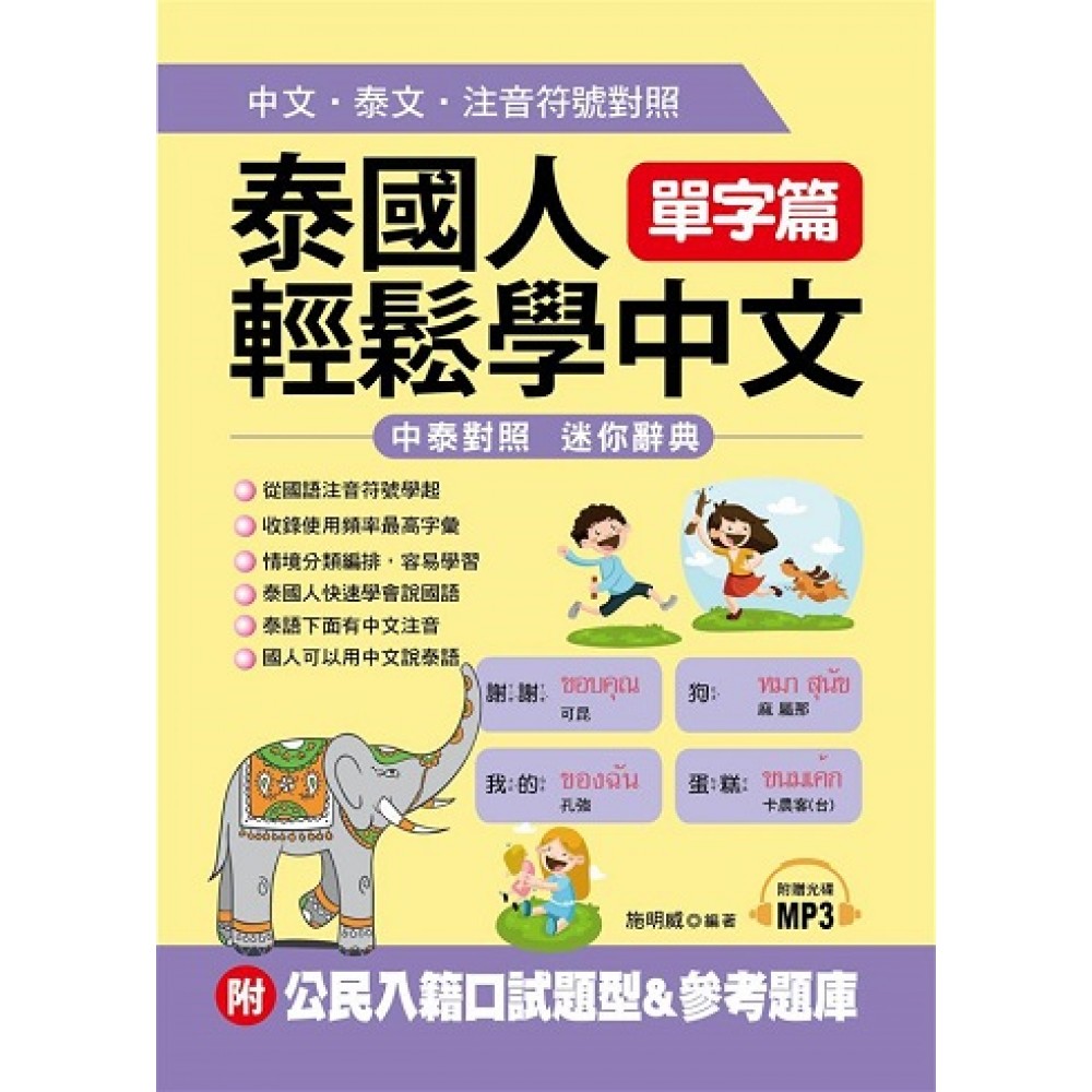 •中泰對照 迷你辭典 •從國語注音符號學起 •收錄使用頻率最高字彙 •情境分類編排,容易學習 •泰國人快速學會說國語 •泰語下面有中文注音 •華人也可以用中文說泰語 國內有為數眾多的泰國朋友、監護工,也有不少泰籍女孩嫁到台灣來,面臨語言、文化、生活適應、子女教育、國籍歸化、工作等難題。她們對台灣的社會、文化認知不清,首先遇到的問題就是語言,造成溝通不良及生活適應上的困難。這些外籍新住民同時還有教養下一代的重責大任,其子女多數有語言發展遲緩、學習及同儕相處障礙等問題,亟待大家重視和關心。 幫助外籍新住民能適應台灣生活 為幫助外籍新住民能適應台灣生活,融入本地文化,內政部擬修正國籍法等相關法規,外籍新住民在取得國籍及居留證前,需先接受語文能力、法治素養、文化認同等基本能力檢測,類似美國要求入籍前要經過入籍面試。 學好語文的關鍵就在字彙: 本書特為泰國朋友編著,從國語注音符號學起,精心收集2000使用頻率最高的單字,採中文、注音符號、泰語、中文拼音對照,依據情境、分類編排,快速掌握必備單字,很快的中文會話也能琅琅上口。附「公民入籍考試參考題庫」,精選入籍口試題型,仿外國人入美國籍的測驗設計,是外籍新娘的最佳參考,考前模擬練習,輕鬆通過語文檢定考,順利成為本國國民。 用耳朵加強聽說能力 為加強學習效果,最好能搭配本書的精質MP3,學習純正道地的中文,有助你掌握實際的發音技巧,加強聽說能力。 中泰對照,中文唸兩遍、泰語唸一遍 MP3內容為中泰對照,中文唸兩遍、泰語唸一遍,請讀者注意錄音老師的唸法,跟著老師的發音覆誦練習,才能講出最標準的發音,反覆練習,自然說出一口流利中文。 本書特色 泰國人自學中文速成單字書 中文、注音符號、泰語、拼音對照,輕鬆開口說中文。 幫助府上的泰國朋友,幫忙家事、監護工、看護,打好中文的基礎。 快速溝通有一套,促進相處和諧。 泰語下面有中文注音,可以用中文學泰語,也適合華人用來做學習泰語的教材。