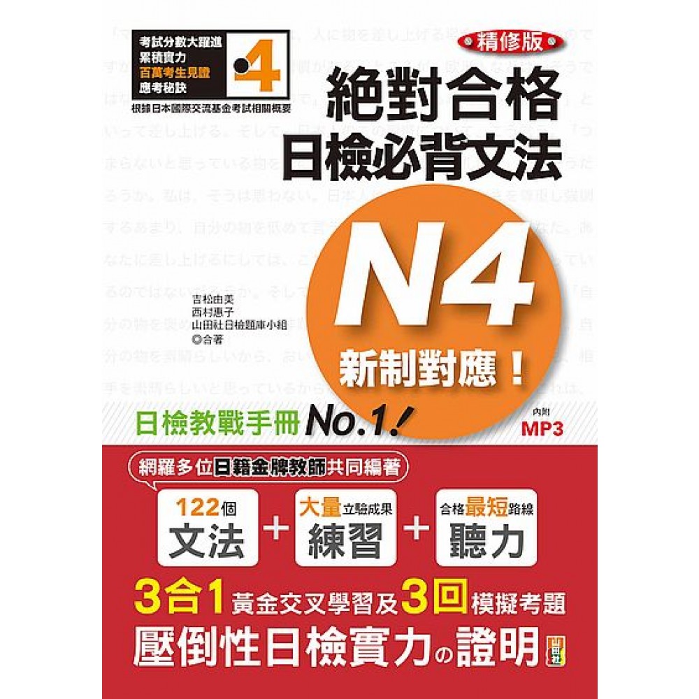 只要找對方法,就能改變結果! 即使文法成績老是差強人意,也能一舉過關斬將,得高分! ★ 百萬考生推薦日檢好書,應考秘訣一本達陣! ★ N4所有122文法×立驗成果4回練習+模考3回×實戰聽力! ★ 百萬年薪跳板必備書!日檢N4必背高頻率出題文法! ★ 魔法般的三合一學習法,讓您樂勝考場! ★ 目標!升格達人級日文!成為魔人級考證大師! 為什麼每次遇到文法就屢戰屢敗? 為什麼每次會用的就那幾個,不會的永遠學不會? 為什麼明明花了許多時間讀,文法成績還是不理想? 如果只有「背」文法,那就不是「學」日文。 尋找適合自己的文法書,就像尋找自己的專屬魔杖一樣。 適合自己的文法書,能讓學過的單字靈活運用到淋漓盡致!隨手一揮,句子「碰!」的一聲就出來了。 本書究竟有什麼樣的魔法,讓文法這麼好「學」呢? 8招魔法,讓學習更輕鬆更有效,讓記憶永遠存在! ★ 看故事書般的創新魔法: 巧妙地將文法書和故事書結合起來!每一項文法都有一張可愛的插圖,配合幽默、令人會心一笑的小故事。利用有趣的故事情節魔法,清楚、細膩地說明文法特色,讓您學習效果立竿見影。 ★ 多元學習的增值魔法: 文法、單字、內容黃金魔法交叉學習!每項文法的例句都暗藏玄機在裡面,因為例句中都精心加入該項文法較常配合的單字、使用的場合、常見的表現,也就是考試常出現的考法。還有,貼近N4程度所需的時事、生活等內容。幫助您完全克服文法考試決勝負的難關!為打下堅實的基礎,建議您搭配《精修版 新制對應 絕對合格 日檢必背單字N4》來進一步配合學習喔! ★ 前後接續的要領魔法: 每項文法前面或後面要怎麼接續呢?考日檢文法的時候,是不是常因為接續方法而失分呢?請放心,本書內容將有接續需求的文法標示出接續方法,只要照著這些公式走,考試就不用擔心啦!書中還貼心地附上文型接續解說,如彙整出形容詞、形容動詞及動詞的否定形、た形、て形…等及名詞普通形、丁寧形等接續用語的說明喔! ★ 類義表現與專欄的輔助魔法: 同樣一句話,光是口語、正式說法,就天差地遠大不相同了!因此,換個說法的類義表現,是考試最常出現的考法。本書文法中補充了一些在N4文法考題中有需求的類義表現,讓您方便進行比較。除此之外,書中還收錄一些日文小祕方的補充專欄(例如被動形、使役形、意向形、可能形及敬語的說明),這些專欄都附有小測驗,能幫助您全方面的學習喔! ★ 多義應用例句的經典魔法: 一項文法大多會隨著前面接續的詞,及前後文意等,而有不同的表現方式,例如「~はずだ」有:一、表示說話人根據事實、理論或知識推測結果「(按理說)應該…」的意思;二、表示說話人對原本不可理解事物,在得知理由後,而感到信服「怪不得…」的意思。許多讀者反映「文法搞不清楚使用情況,好難選出答案!」為了一掃您的擔憂,書中將所有符合N4文法程度的使用狀況細分出來,並列出相對應的例句,讓您看到考題,答案立即選出! ★ 打造日語耳的相乘魔法: 新制日檢考試,把聽力的分數提高了,合格最短距離就是加強聽力學習。為此,書中還附贈光碟,幫助您熟悉日籍教師的標準發音、語調與符合N4聽力的朗讀速度,讓您累積聽力實力。為打下堅實的基礎,建議您搭配《新制對應 絕對合格!日檢聽力N4》來進一步加強學習。 ★ 4回練習+模考3回題庫魔法: 本書附有4回立驗成果的練習問題,跟3回的新日檢擬真模擬考題,這些都是金牌出題老師們經過多年分析、研究歷屆考古題,精心編寫的考題!模擬考題還依照不同的題型,告訴您不同的解題訣竅。讓您在演練之後,不僅能立即得知學習效果,並能充份掌握考試方向,以提升考試臨場反應。就像上過合格保證班一樣!如果對於綜合模擬試題躍躍欲試,推薦日檢全真規格的《合格全攻略!新日檢6回全真模擬試題N4》進行練習喔! ★ 文法速記表魔法小工具: 文法重點,一覽無遺的文法速記表,不僅依照本書內容做排序,還附有文法中譯。速記表可以讓您在最短的時間內進行復習,還可以剪下來隨身攜帶,是前往考場,考前復習的高分合格護身符。它更是最便利、最精華的N4文法資料庫!書中還附上讀書計畫表,讓讀者能按部就班進行讀書計畫。有計畫絕對就會有好成績喔! 如果在書店拿起這本書,請不要放下。如果在網路書店看到這本書,不要忘記試閱一下。這「不」是一本跟其他文法書沒什麼兩樣的文法書,這是一本有著小小魔法的文法書,能將您帶領到日文高手的世界。
