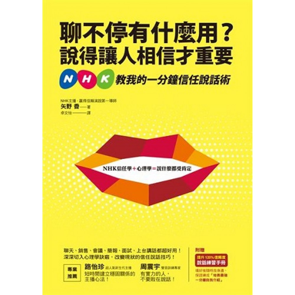 NHK的信任學+心理學=說什麼都受肯定! 聊天、銷售、會議、簡報、面試、上台講話都超好用! 深深切入心理學訣竅,改變現狀的信任說話技巧! 附贈「說話練習手冊」 填好後隨時放身邊,保證練成「地表最強一分鐘自我介紹」 逆轉!從一個被解雇的播報員,到節目收視率20%的王牌主播,她的獨門絕招,就是「信任說話術」! 矢野香原本是一個收視率平平、被解雇的播報員,後來她重新考進日本NHK主播台,受到NHK式的信任學洗禮,加上活用心理學技巧,一躍成為人氣主播,且長盛不衰17年。她在本書中分享這個「一分鐘贏得一生信賴的說話技巧」,只要融會其中技巧,任何場合、任何對象,甚至是面對成千上萬人的演講,你都能從容贏得注目與信賴。 ˙簡報時,你講得2266,對方會主動幫你解釋的要訣是什麼? ˙見客戶時,每一個動作都在傳達「答應我」說法是什麼? ˙提案時,把手擺在桌上提案就能通過,為什麼? ˙聊天時,什麼是15秒就將氣氛炒熱的開場白? ˙報告時老是超平淡?想讓你的聲音有表情,請使用「樂譜式擬稿法」 ˙每次會議提出意見都被否決嗎?把手擺在桌上就能通過!為什麼?