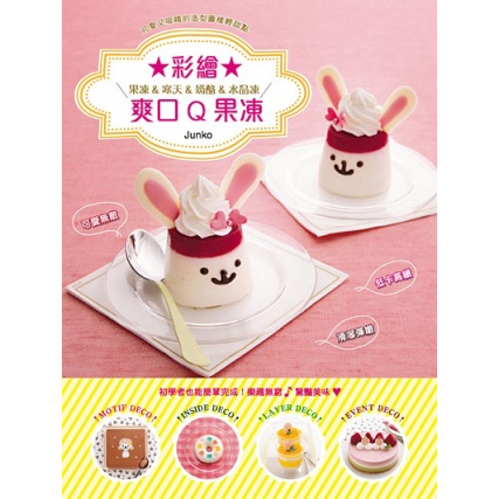 ★DECO JELLY BOOK★ 低卡高纖‧滑溜彈嫩‧可愛無敵 風靡日本&台灣的彩繪甜點系列的作者Junko, 又一全新可愛造型甜點力作,新手也能輕鬆完成。 首次公開、保證市面上沒有見過, 獨特性、造型感、吸睛度皆百分百的可愛造型彩繪清涼點心。 >>親手製作的可愛造型,絕對會引起眾人的矚目。 >>低卡高纖的涼感果凍,也能是瘦身的絕佳夥伴。 >>口感彈潤且老少咸宜,是適合各種場合的百搭美味。 簡單的果凍,也能發揮無限變化。依食材及成品造型來自由運用吉利丁、寒天粉和洋菜粉,將其加熱融入果汁等液體中,再倒入模型裡,散熱放涼即可享用。只要掌握基本作法,花點巧思就能發揮創意,做出多元變化的繽紛輕甜點。 本書分成四大技法來完成,有先製作圖案用果凍液,完成有繽紛英文字母、笑臉、可愛小熊的圖案彩繪技法。將星星、熊貓等造型果凍或奶酪完成後,鑲嵌入果凍或奶酪體的鑲嵌造型技法。 依顏色或材料分層製作完成出多層次裝飾技法,看似困難,實則簡單易做。以及綜合前面三項技法完成春天的春櫻浪漫水晶寒天、聖誕節的聖誕老人與馴鹿的巴伐利亞奶凍等等,依季節或活動做出12個月的主題點心。 手作QQ果凍安心又美味,加上使用都是手邊現有的材料及道具,方便購得,而且想吃就能馬上動手做,份量任憑自己決定。比起蛋糕或餅乾等烘焙類點心,還來得簡單又輕鬆。不妨親子共同來製作吧! 本書特色 ◎日本AMAZON網站5顆星誠摯推薦 ◎果凍&寒天&奶酪&水晶凍&慕斯,滿載可愛又吸睛的造型圖樣輕甜點 ◎沁涼輕甜點不限季節,可全年享用。低卡高纖又有飽足感,是午茶夜宵的美味小點心~ ◎全書每道食譜皆有標示使用的凝固材料及製作難易度,方便讀者製作前參考。 AMAZON網站5顆星絕讚推薦 小朋友保證會喜歡! 基本果凍製作上很簡單,只要加上彩色糖漿就能輕鬆上色了。我試著製作巧克力慕斯,因為加入了滿滿的鮮奶油,呈現的口感非常地濃郁。在盛夏季節中享受清爽好滋味!- 讀者Rhodochrosite 本書收錄了和菓子般的「豹紋咖啡歐蕾水晶奶酪」、果凍中浮現表情的「可愛熊貓水晶芝麻奶酪」、大人味的「銀河星辰水羊羹」等等,兼具設計及技術的漂亮圖樣。與蛋糕相比又不會太甜,這種滑嫩彈潤的輕點心保證大家都會喜歡!-讀者ab 用果凍做造型很有趣!具豐富內容、多張圖片解說,簡單又明瞭。-讀者結城小姐