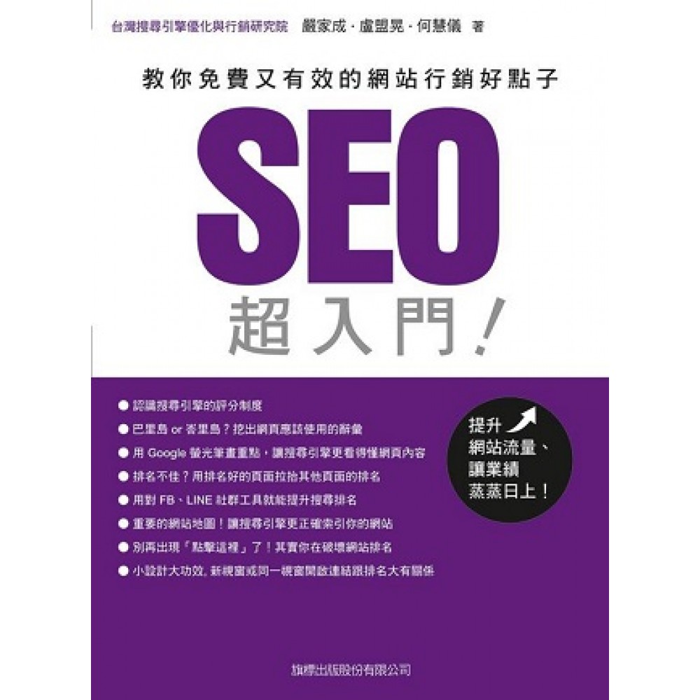 嚴家成 博士 台灣搜尋引擎優化與行銷研究院主編、國立虎尾科技大學資訊管理系兼任助理教授、兼任圖書館資訊系統組組長。曾任三屆國際電氣與電子工程師學會虛擬環境及人機介面與測量系統國際會議技術審查委員、國立虎尾科技大學企業管理系兼任講師、電機系兼任講師、育成中心企業顧問、美商硬體公司技術工程師、美商資訊部門經理及科技公司技術部門經理等職務。著有「SEO 關鍵解碼」、「網路行銷也可以這樣玩」、「網站營銷與搜索引擎優化」及「網站排名的秘密」等書。 盧盟晃 博士 台灣搜尋引擎優化與行銷研究院資深顧問、中國文化大學數位媒體設計學系兼任助理教授、世新大學圖文傳播學系兼任講師、桃園創新技術學院企業管理學系助理教授。開設全國大專院校第一門搜尋行銷正式課程,曾任中華青年網路協會創會執行長,並擔任精品旅館集團顧問,長期從事數位行銷及創業輔導工作。著有「網路創業成功密碼」、「SEO 關鍵解碼」、「網站營銷與搜索引擎優化」及「網站排名的秘密」等書。 何慧儀 博士 台灣搜尋引擎優化與行銷研究院資深顧問、文化大學推廣教育部廣告學系專任助理教授兼副主任、世新大學圖文傳播暨數位出版學研究所兼任助理教授。美國 University of the Incarnate Word 國際教育與創業管理博士,南華大學出版事業管理研究所碩士,文化大學印刷傳播學系學士。曾任中華青年網路協會網站經營部主任、財團法人中華出版基金會行銷總監。專長為網路行銷、網路社群經營、消費者行為研究。相關專業認證為 Google Adwords 關鍵字廣告、IBM SPSS 商業數據分析師、網路輿情分析師等。 台灣搜尋引擎優化與行銷研究院seo.dns.com.tw