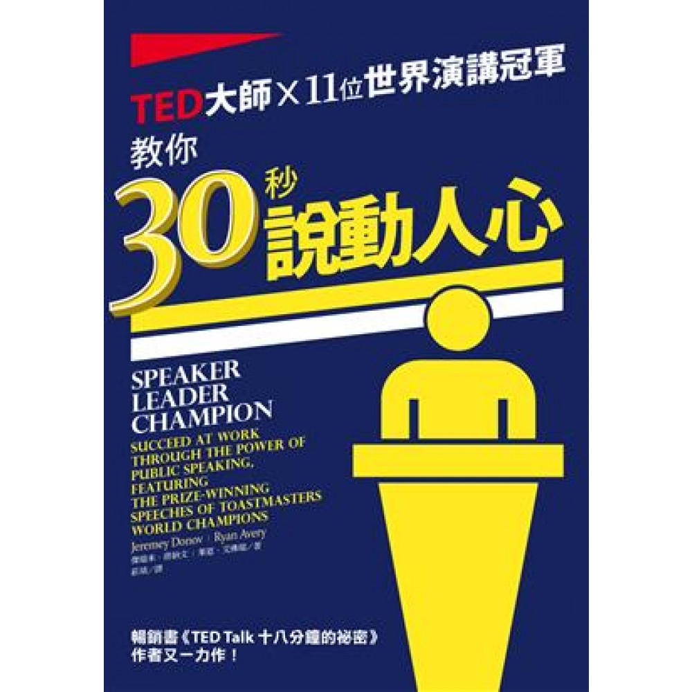 傑瑞米.唐納文(Jeremey Donovan) 在每年營收達16億美元的顧能(Gartner)公司擔任集團行銷副總裁,經常率領團隊負責市場研究、新產品開發、行銷、購併和產品管理。他也是國際演講協會最高等級的「傑出會員」(Distinguished Toastmaster),曾三度主辦TEDx活動,亦為TEDx講者和演講教練。暢銷著作包含:《TED Talk十八分鐘的祕密》(How to Deliver a TED Talk)、《大師風采》(What Great Looks Like)。 萊恩.艾佛瑞(Ryan Avery) 2012年國際演講協會世界演講賽冠軍,當年25歲的他也是有史以來最年輕的優勝者。身為獲得艾美獎的新聞從業員,他經常發表主題演講並主持研討會,協助有志演講的人改進並傳達訊息。